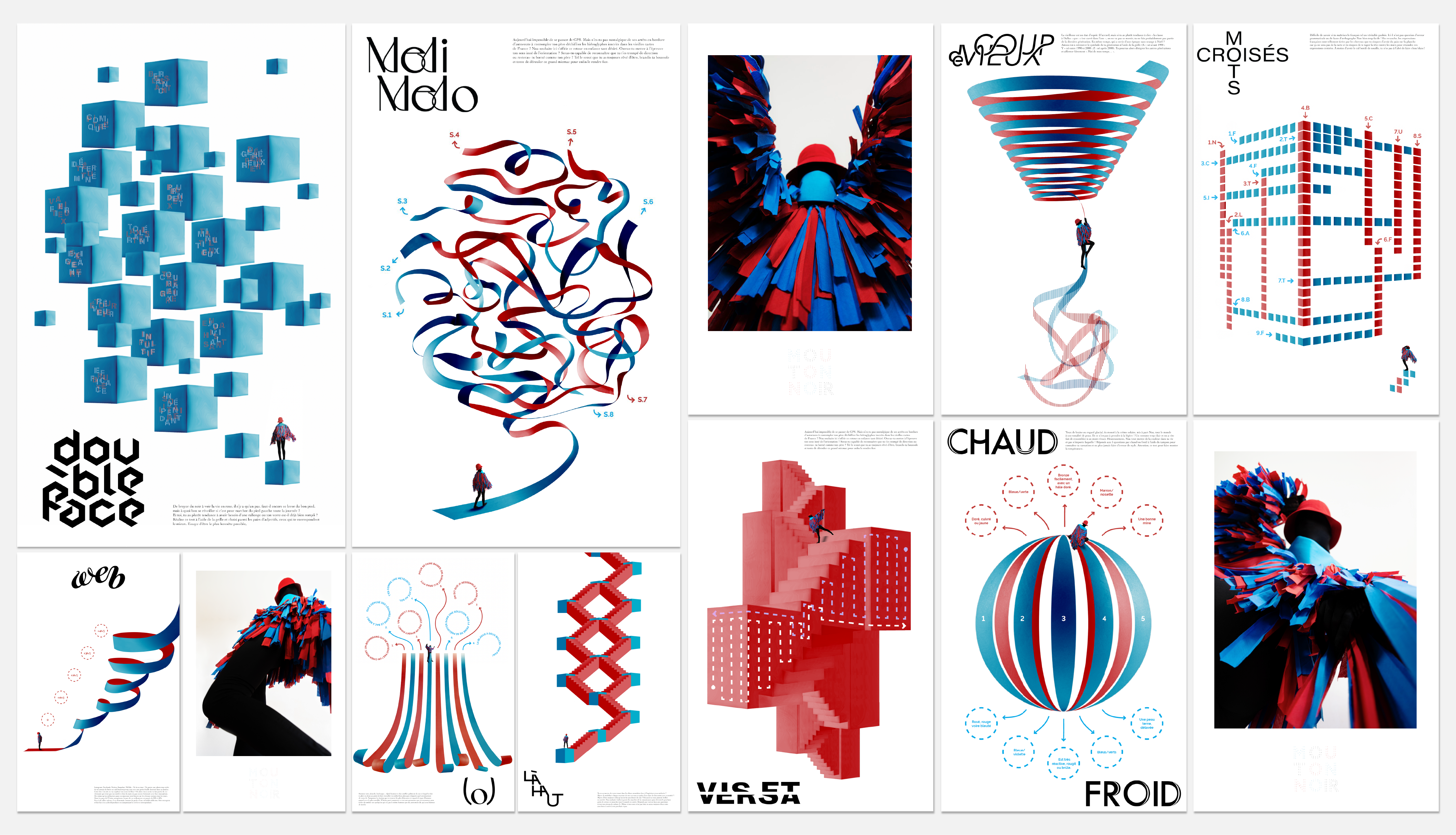 Mouton Noir is a series of posters that explores the notion of difference through the lens of childhood. Drawing on the visual codes of children’s games, the project creates a universal language in which each poster functions as a visual riddle, actively engaging the viewer. The minimalist graphic approach, composed of collages and geometric shapes, interacts with a binary palette of vivid red and blue, whose striking contrast evokes the world of toys and playgrounds. The title Mouton Noir echoes the expression referring to the one who stands apart from the group, embodying the core message: celebrating what diverges from the norm. A mysterious character appears throughout the visuals, creating a narrative thread and inviting the viewer to follow its singular journey.